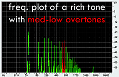 Looking at these graphs, it's easy to see that the fundamental appears at around 63 Hz, and then the overtones appear in decreasing
